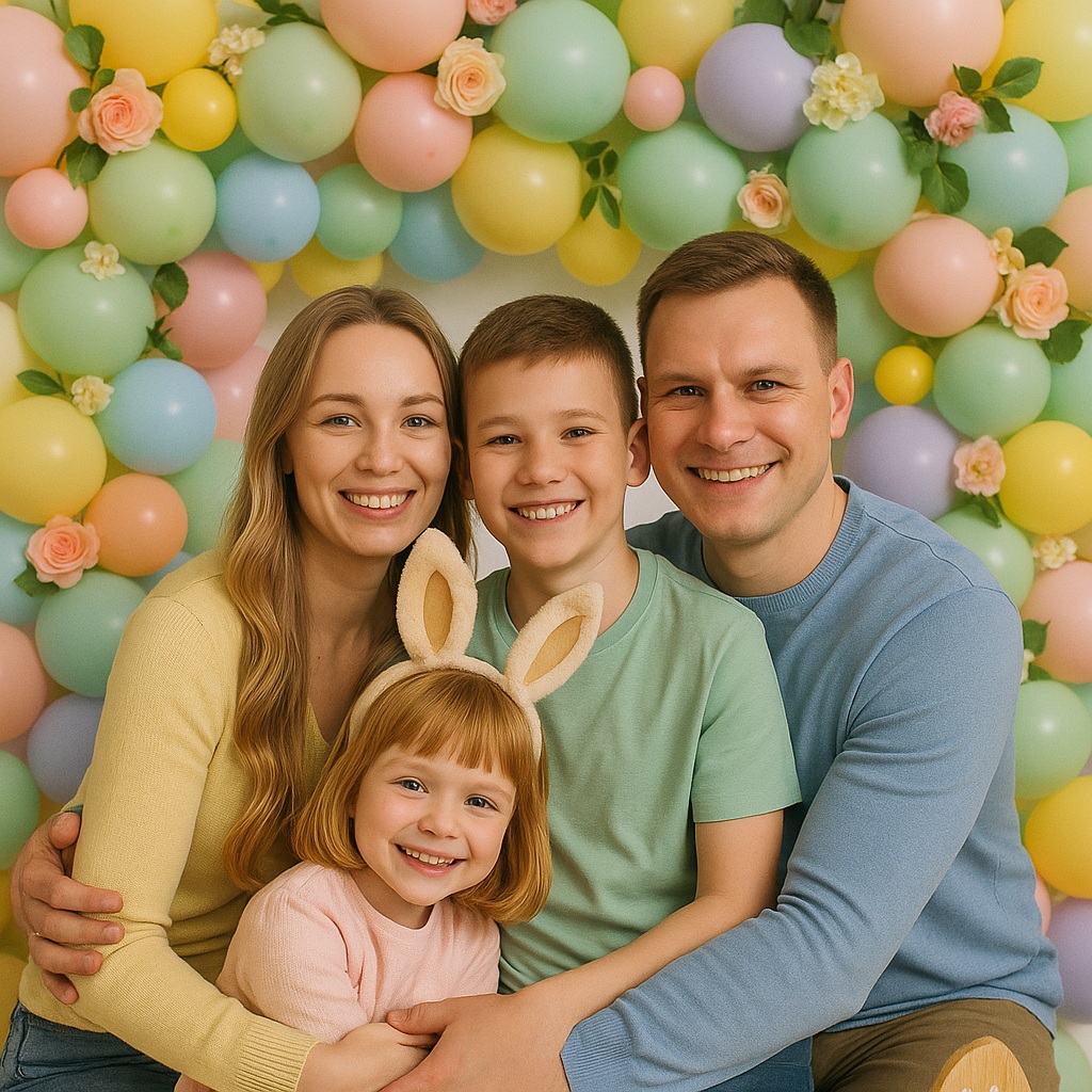 Sukurkite įspūdingą foną velykiniams šeimos portretams! Pritvirtinkite įvairių dydžių ir atspalvių balionus prie sienos ar specialaus rėmo, kurdami spalvingą ir linksmą foną. Pridėkite dirbtinių gėlių, popieriaus dekoracijų ar net velykinių užrašų. Šis fonas ne tik suteiks galimybę sukurti nuostabias nuotraukas, bet ir taps įspūdingu namų dekoro elementu.
